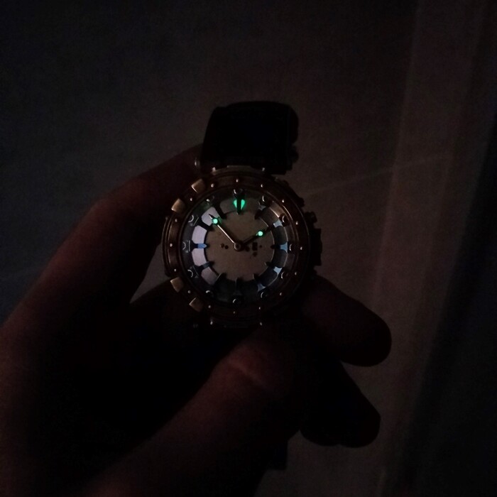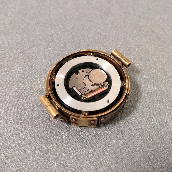 После запекания указателей и вытачивания ещё одного колечка можно приступать к сборке алюминиевого кейса, в котором находится механизм. Он же является циферблатом. За кадром были подрезаны головки и ножки винтов, изготовлена латунная втулка, светомассой были залиты нужные отверстия.