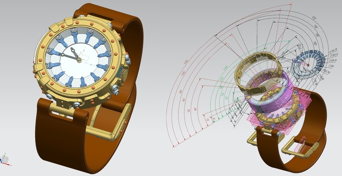 Перед изготовлением была проработана 3D-модель. Не идеально, т. к., например, отсутствуют винты, крепящие ремешок к корпусу, но мне этого достаточно. В процессе изготовления корпуса часов в модели появлялись дополнительные построения, необходимые для каких-то технологических операций: