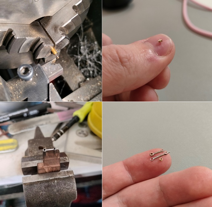 Часовую и минутную стрелки изготавливал из куска нержавейки и латунного прутка. Сложновато было точить втулки с внутренним диаметром 1,20 мм и 0,70 мм, но в итоге всё получилось: