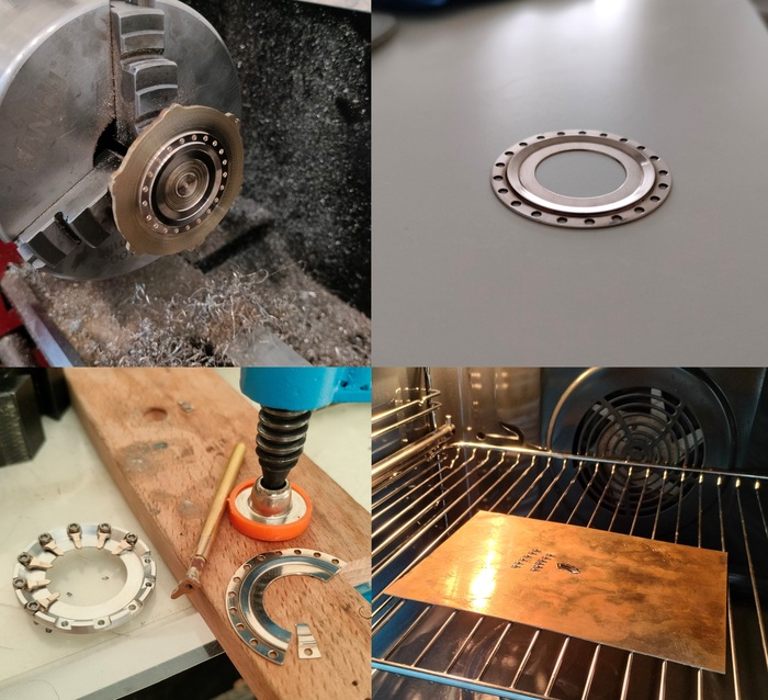 Я заранее решил, что хочу необычный цвет, и с этим мне помог мельхиор и его оксидная плёнка. Правда, точить его сложно - это вязкий и мягкий материал. Пришлось обрабатывать его, приклеив заготовку на специальную "планшайбу". Разрезать получившийся диск на отдельные указатели - не проблема. Проблема - это сделать все 12 штук одинаковыми. Пробовал использовать шаблон и обрабатывать попарно. В итоге лучший результат получился при обработке "на глаз" и контроле размеров с помощью штангенциркуля.