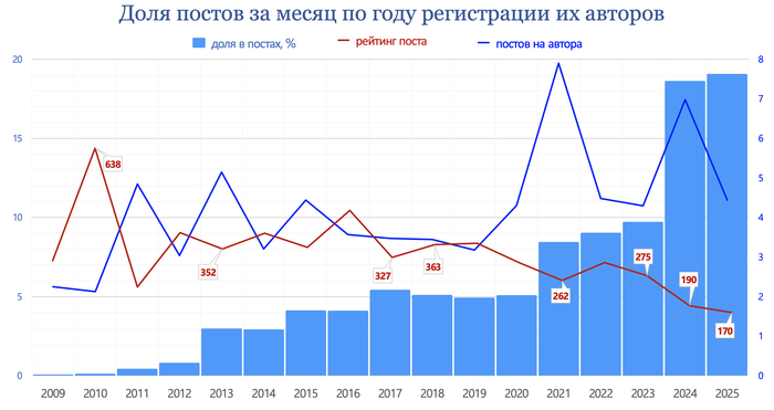 Из 112 017 постов, написанных в октябре, имели рейтинг выше 10 000 - 135, от 5 000 до 10 000 - 826 (0,8%), от 1 000 до 5 000 - 5 497 (5,2%), от 100 до 1 000 - 16 599 (15,6%), от 0 до 100 - 65 492 (61,4%), с отрицательным - 18 188 (17,0%).