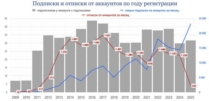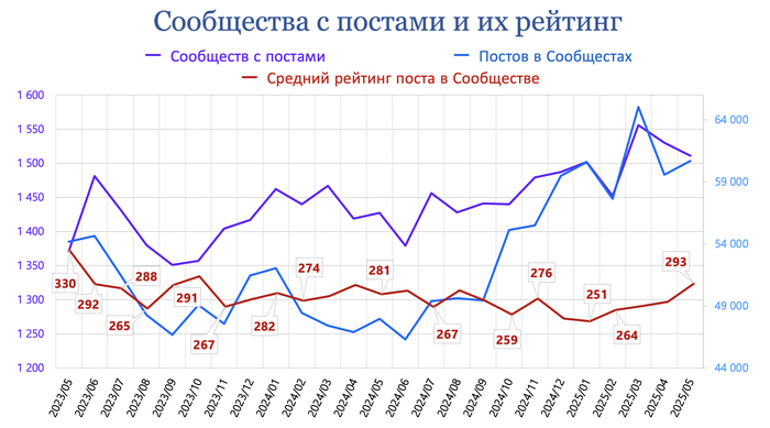 Пользователей, оформивших подписки на авторов или сообщества, на конец месяца было 1 757 978 (на 10 470 больше предыдущего). Суммарно число их подписок составило 21 064 067, из них 6 671 887 (32 %) на сообщества.