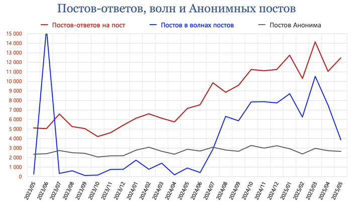 Постов-ответов на пост написано 13 647 (12,2%, на 25% больше к предыдущему месяцу).