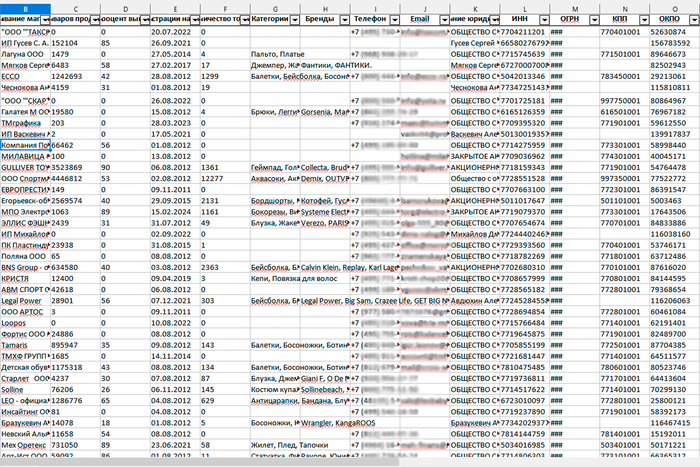 В итоге клиент получил базу из 600 тысяч контактов компаний из открытых источников с актуальными номерами телефонов. Её можно отфильтровать и найти тех продавцов на Wildberries, кому потенциально интересны услуги фулфилмента.