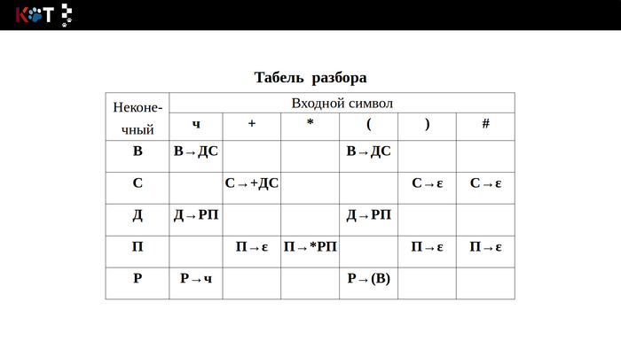 Большая часть пути пройдена, осталось научится создавать табель. Что он из себя представляет? А он представляет из себя пары конечного и неконечного символа и связанные с этими парами продукции. И так, для каждой продукции П → α выполним: