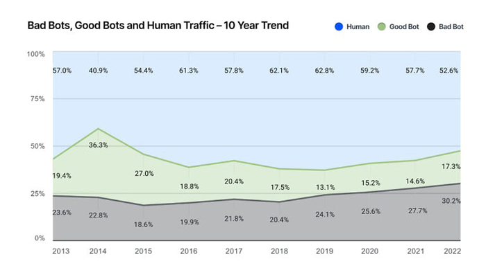 Согласно отчётам последних лет, боты генерируют от 40 до 50% трафика в мировой сети. Но что гораздо хуже, их трафик становится всё более вредоносным. Доля вредных ботов по данным Akamai Technologies, уже выросла до 65%. Тогда как в 2022 году вредоносными были только 30%.