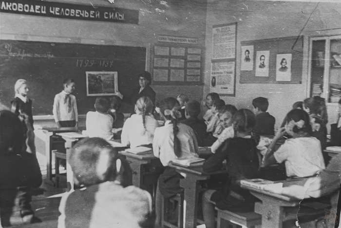 Начнём с фотографии из повседневной жизни. В центре внимания — школьный урок. На доске мелом написаны даты «1799–1837», вероятно, обсуждение жизни и творчества Александра Сергеевича Пушкина на уроке литературы.