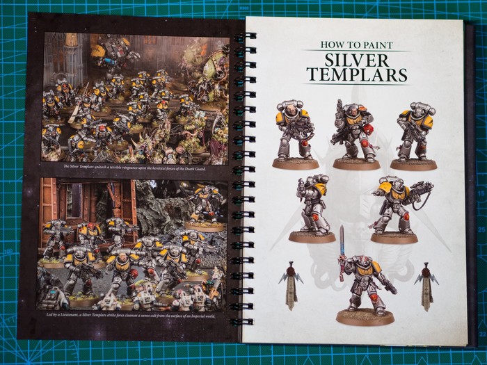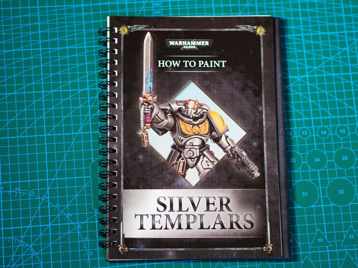 Внутри вас ждут литники с миниатюрами, краски и книжка-руководство по покрасу с бэком нового ордена Серебряных Храмовников