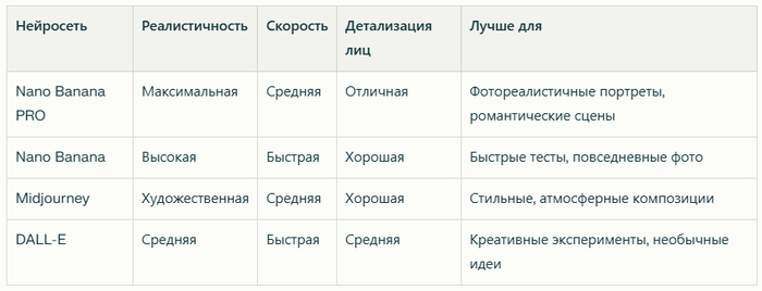 Nano Banana PRO остаётся оптимальным выбором для создания фотореалистичного изображения партнёра благодаря точной передаче черт лица, правильной анатомии и естественному освещению. Используйте Nano Banana для быстрых тестов, Midjourney — для художественных композиций, DALL-E — для креативных экспериментов с необычными сценариями.