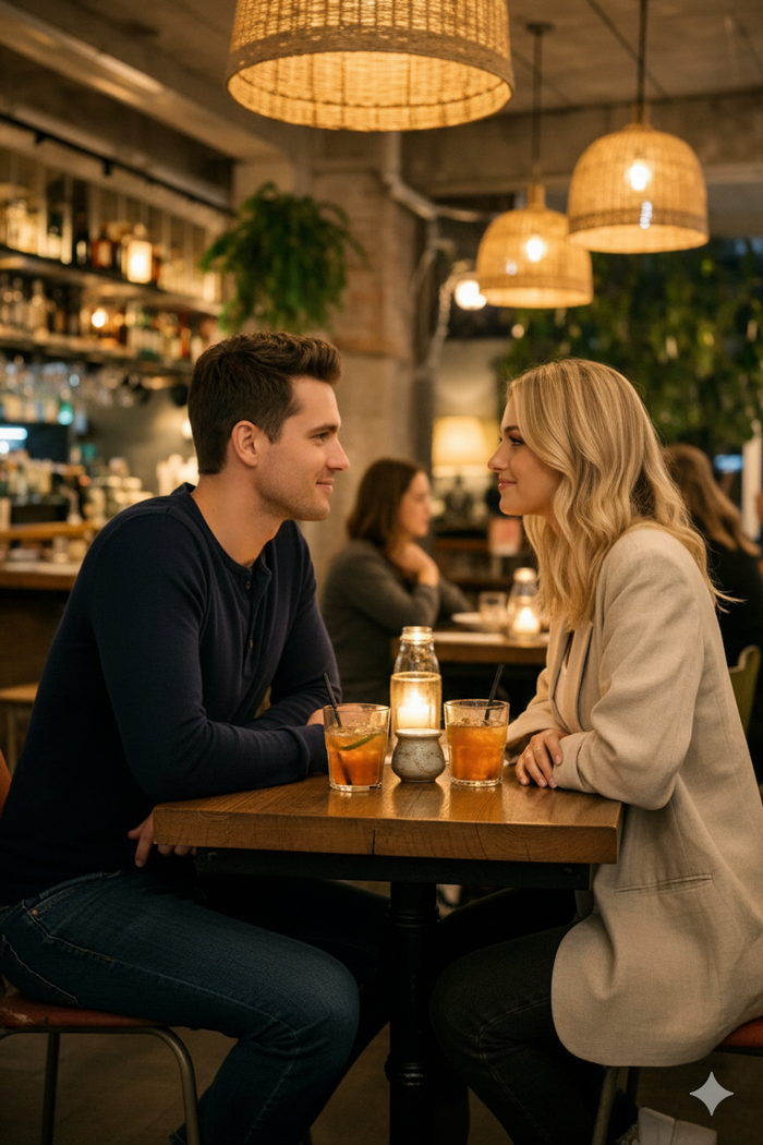 ИИ сгенерируй рядом со мной мужчину, который мне подходит. Мы сидим в уютном кафе за столиком, смотрим друг на друга, тёмные волосы, стильный casual стиль, мягкое освещение, тёплые тона, реалистично