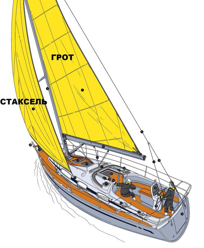 Грот -основной парус в задней части судна. Он несет на себе функцию стабилизации яхты (от качки и рысканья) и передачи ей части движущей силы.Стаксель -треугольный парус впереди яхты именно он дает основную тягу.