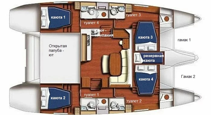Вид на кат сверху. Можно устроиться за столом на корме, загорать на крыше или лежать на сетках-батутах на носу.