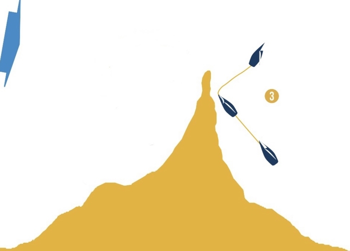 7. Когда выпавший окажется на траверзе яхты, следует сделать еще один поворот оверштаг, затем полностью потравить шкоты и обезветрить паруса, чтобы яхта успела остановиться. Важно: подходим в бейдевинд, растравливая паруса, тем самым, снижая скорость