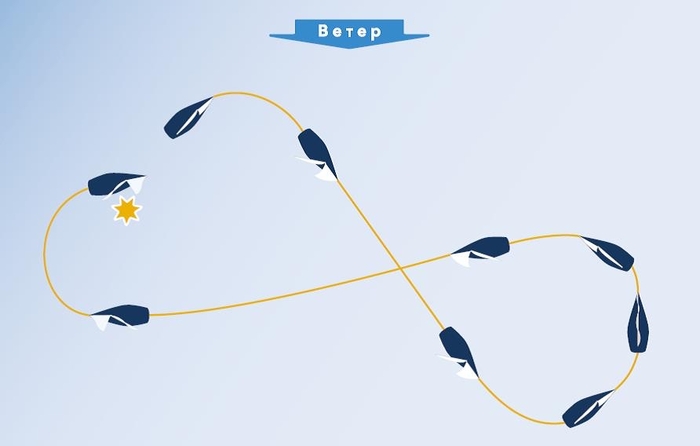 5. Пройдя бакштагом около 5-6 корпусов лодки, следует привестись и сделать поворот оверштаг, после чего опять увалиться до бакштага или галфвинда, уже на другом галсе.