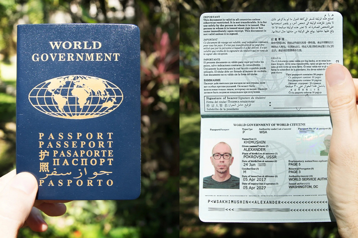 На фотографии паспорт, выданный известному российскому фотографу Александру Химушину. Его работы, посвященные главным образом коренным народам всего мира, заслужили огромное признание и даже выставлялись в здании парижской штаб-квартиры Организации ООН. В целом же паспорт гражданина мира представляет собой 30-страничный документ, весь текст на котором продублирован на семь языках - английском, французском, испанском, русском, арабском, китайском и эсперанто.