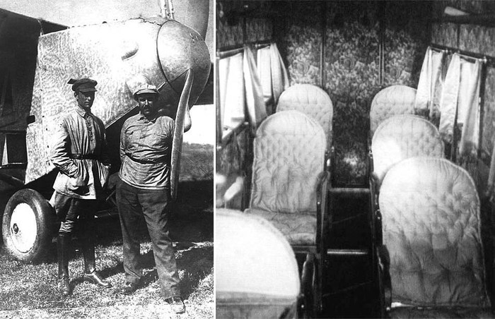 Константин Калинин (справа) возле одного из своих самолетов и облицованный пробковыми панелями салон К-5. В задней стенке - дверь в санузел.