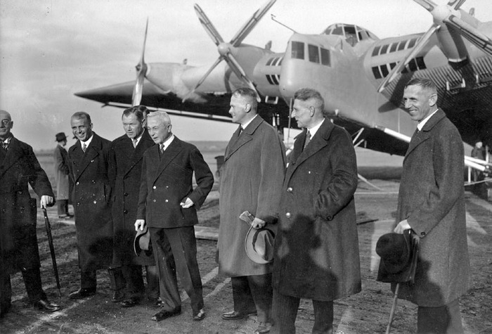 Группа авиаконструкторов, участвовавших в разработке G-38 на фоне первого экземпляра машины. Невысокий пожилой господин в центре - Хуго Юнкерс.