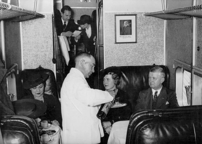 Стюард в полете разносит пассажирам вино. Обратите внимание, что салон G-38 был "полутораэтажным". Его передняя часть располагалась почти на полтора метра выше задней, поскольку под ней проходили верхние полки лонжеронов крыла.