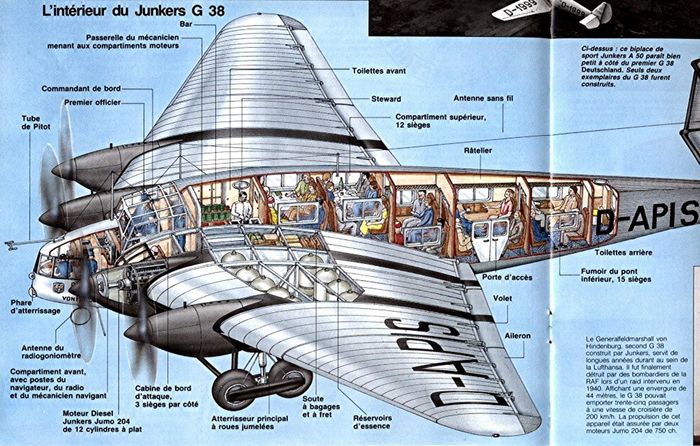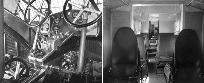 Пилотская кабина и пассажирский салон G-38. Экипаж самолета состоял из семи человек - пилотов, бортмехаников, радиста и стюардов. Авиалайнер перевозил 32 пасажиров, при этом 26 человек сидели в двух фюзеляжных салонах, а еще шесть - в передней застекленной секции крыла, между фюзеляжем и внутренними мотогондолами. Кроме того, на борту имелась мини-кухня, каюта стюардов, курительная комната и санузел.