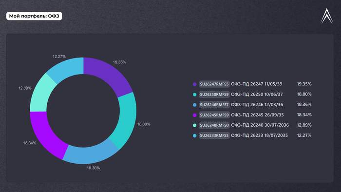 Длинные ОФЗ продолжают давать отличную доходность, покупать их приятно, апсайд солидный. Буду брать те же 6 выпусков с ежемесячными купонами: 26233, 26240, 26246, 26245, 26247, 26250. Это у меня в первом приоритете.