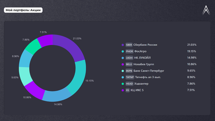 Сейчас у меня в портфеле: Сбер, ФосАгро, ЛУКОЙЛ, Новабев, БСПб-ао, Татнефть-ап, Хэдхантер, X5. Всего 8 штук, и я считаю, что на данном этапе пока что хватит, лучше усилить лучшие.