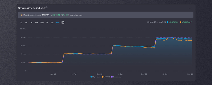 Раз в месяц пополняю портфель на 20 000 рублей — бюджет пока позволяет только так, но регулярность — наше все 💪 Моя главная цель — получать денежный поток любыми способами. Все мои пополнения, покупки и полученный пассивный доход можно увидеть в моем публичном портфеле.