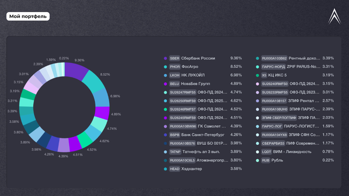 Акции (~45%) — Сбер, ЛУКОЙЛ, Татнефть-ап, ФосАгро, Белуга, Банк СПб, X5 и Хэдхантер.