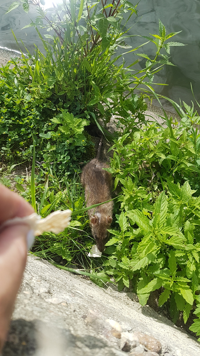Вот такая зверюга выбежала полакомиться лавашиком и уроненным мной кусочком маршмеллоу на берегу пруда. Да, это не самая полезная пища для крыс, но этой даме было плевать на крысиные диеты)