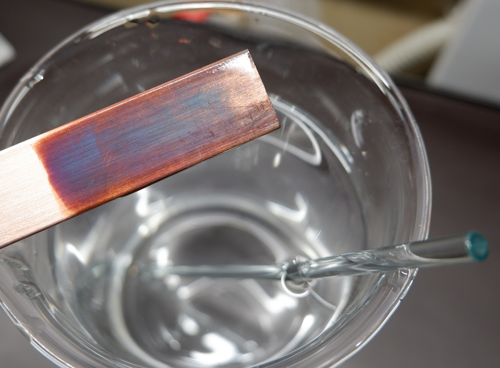 При дальнейшем протравливании медь приобрела синий оттенок.