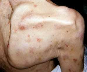 На коже шеи, груди, живота спины, верхних конечностей, передних поверхностях бедер уже множественные эрозии в разных стадиях заживления, корочки, очаги послевоспалительной гиперпигментации и рубцы.