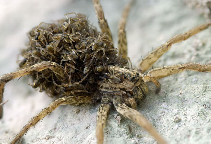 Если деток больше двух сотен, то они могут ровным слоем покрыть всю паучиху, оставив одни глаза. Таких восьминогих лучше выгонять из дома, а не убивать - прихлопнешь тапком одного большого - получишь сто маленьких, избавиться от которых будет уже не так просто.
