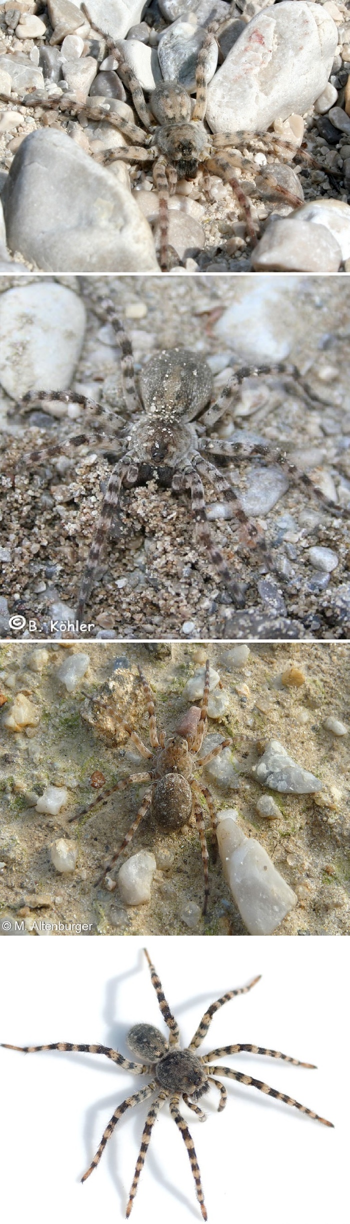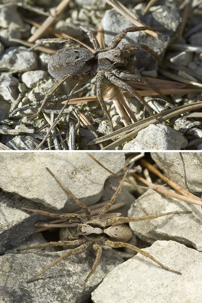 Arctosa cinerea, от Европы до Дальнего Востока, селится на побережье рек и морей, маскируется под песочек, но сесть на него голой жопой курортнику не грозит - паук не любит заселённые людьми районы:
