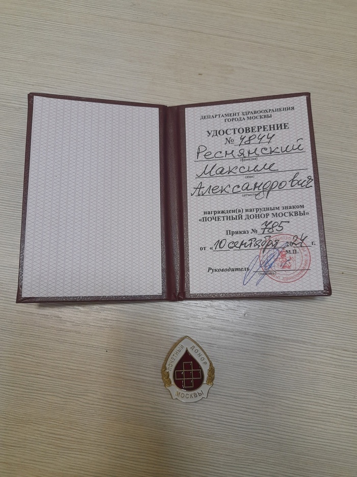Приказом № 785 Департамента здравоохранения города Москвы от "10" сентября 2024 г. мне присвоено звание "Почётный донор Москвы".