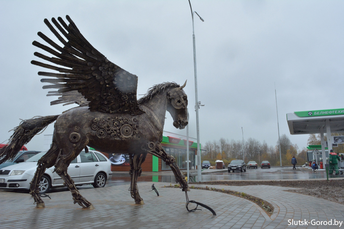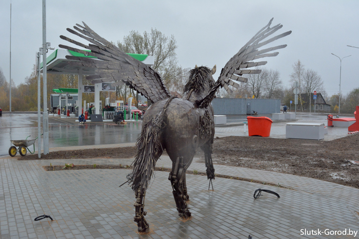 Но вот пегас, который поставили на одной строящейся заправке. Заправке, Карл! Эта лучшая из скульптур Слуцка. Хочу поделиться. Фотографировал не я, а местная газета. Сам я там еще не был, видел издали проездом, но обязательно схожу вместе с ребетенком.