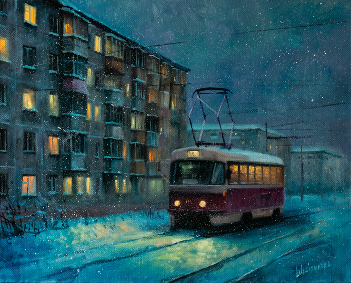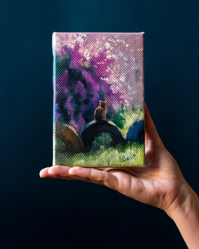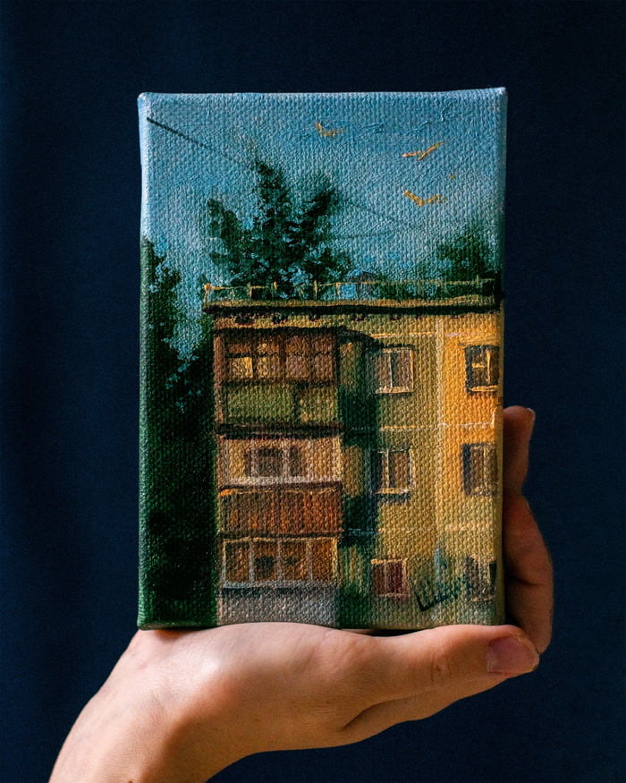 В декабре я сделала маленькую во всех смыслах "коллекцию" из десяти работ, каждая размером 10х15см. Это самые настоящие картины, холст и масло, просто размером с ладошку. Покажу три своих самых любимых пейзажа