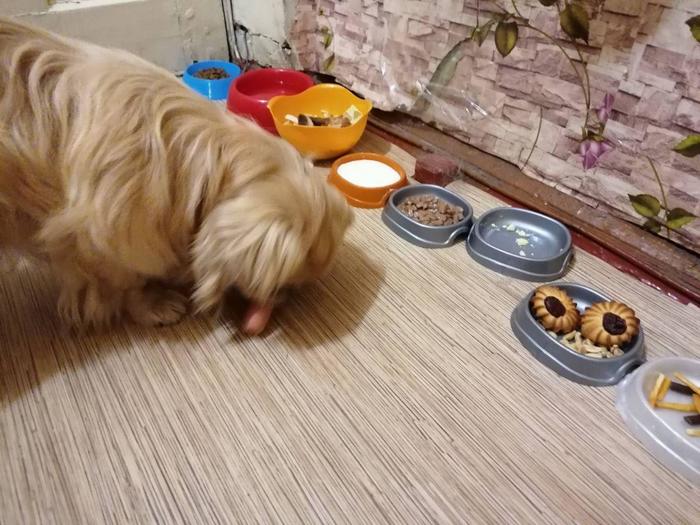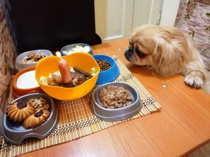 Вместо свечи – сосиска, символизирующая один год. Хоть, пёсель и не понял ничего, но был безумно рад повышенному вниманию. В мисках именно то, что он любит в первую очередь.