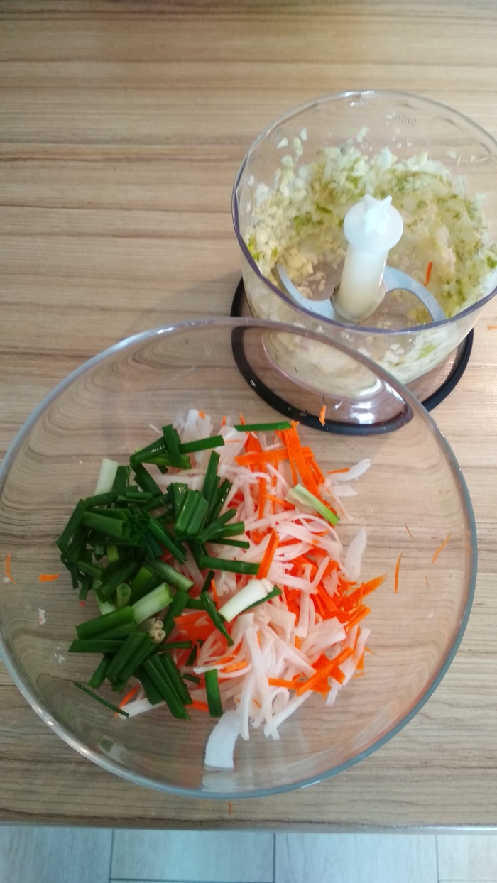 Пока капуста просаливается подготавливаем заправку. Дайкон, половину груши и морковку нарезаем соломкой, зеленый лук на кусочки примерно 2-3 см. Репчатый лук, вторую половину груши, чеснок и имбирь измельчаем блендером или через мясорубку.