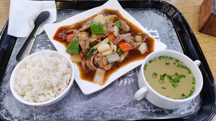 Говядина с овощами и рисом. Точка Пекинская жареная утка. Саму утку я не брал, в говядину съел с удовольствием. Бульон не впечатлил но он есть и это хорошо.