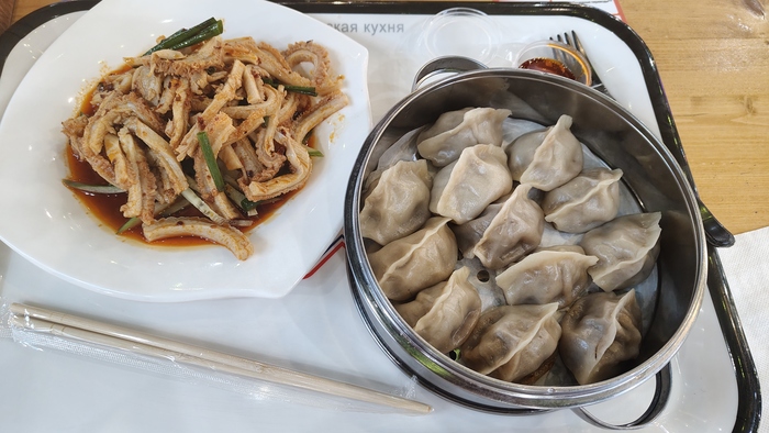 Пельмени с телятиной и салат из говяжьего рубца с битыми огурцами. Точка - Шасяньская кухня в ТЦ Дружба. В целом, все китайские уголки в этом месте демократичны и отличаются очень умеренными ценами. Может быть остро, залито перечным маслом и слишком много.