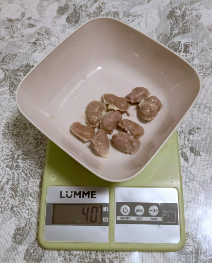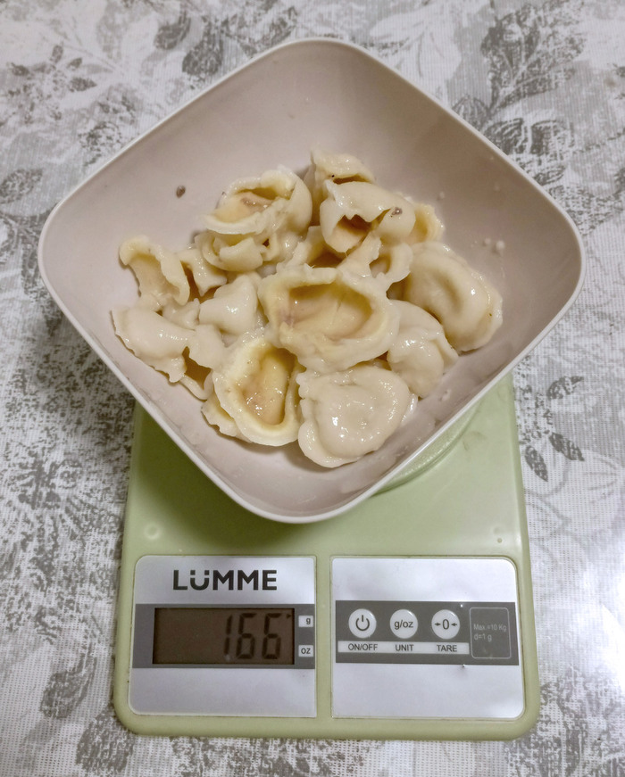 Три пельменя показали следующие результаты: «мясо» — 15 граммов, тесто — 44 грамма. «Ни хера себе соотношение, 3:1» — подумал я. Но, в конце концов, три пельменя это не показатель, может быть, тут вкралась ошибка, надо бы проверить. И я раздеваю оставшиеся девять пельменей (всё равно жрать невозможно, так хоть поэкспериментировать). Вот вам пруфы в виде фото (тара обнулена).