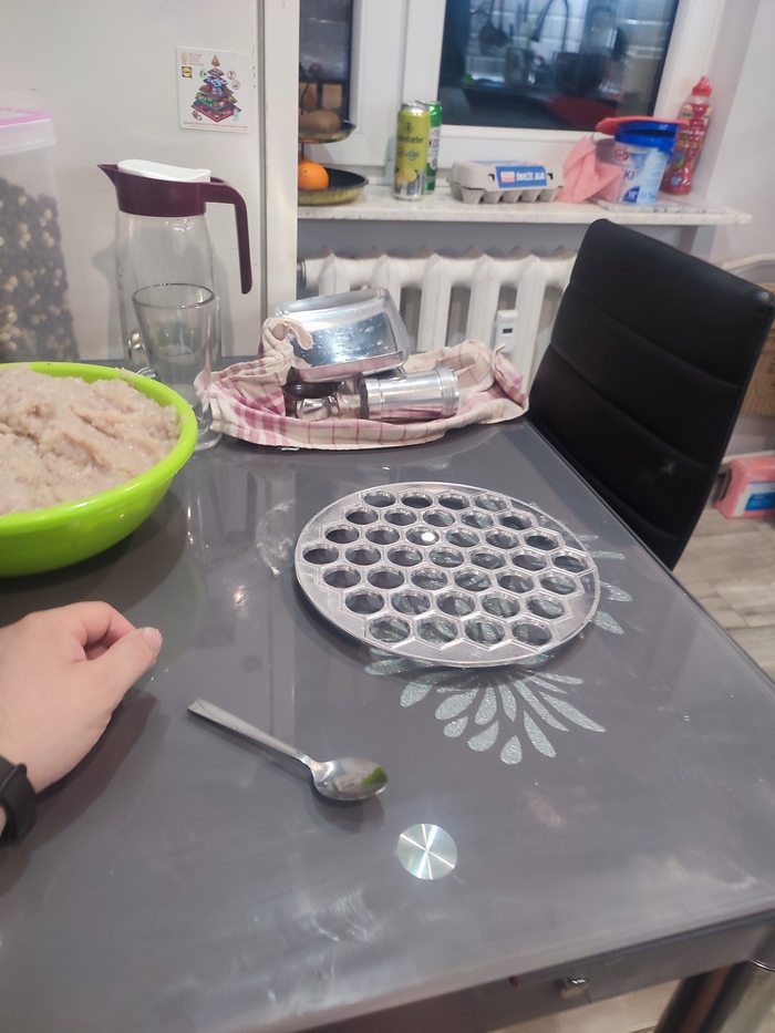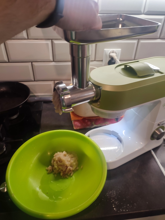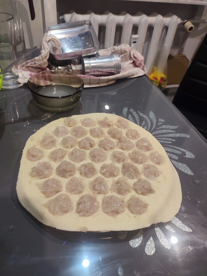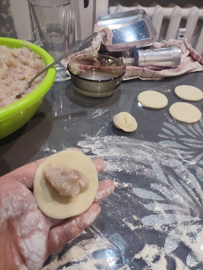Жена начинает катать тесто я отвечаю за мясо.