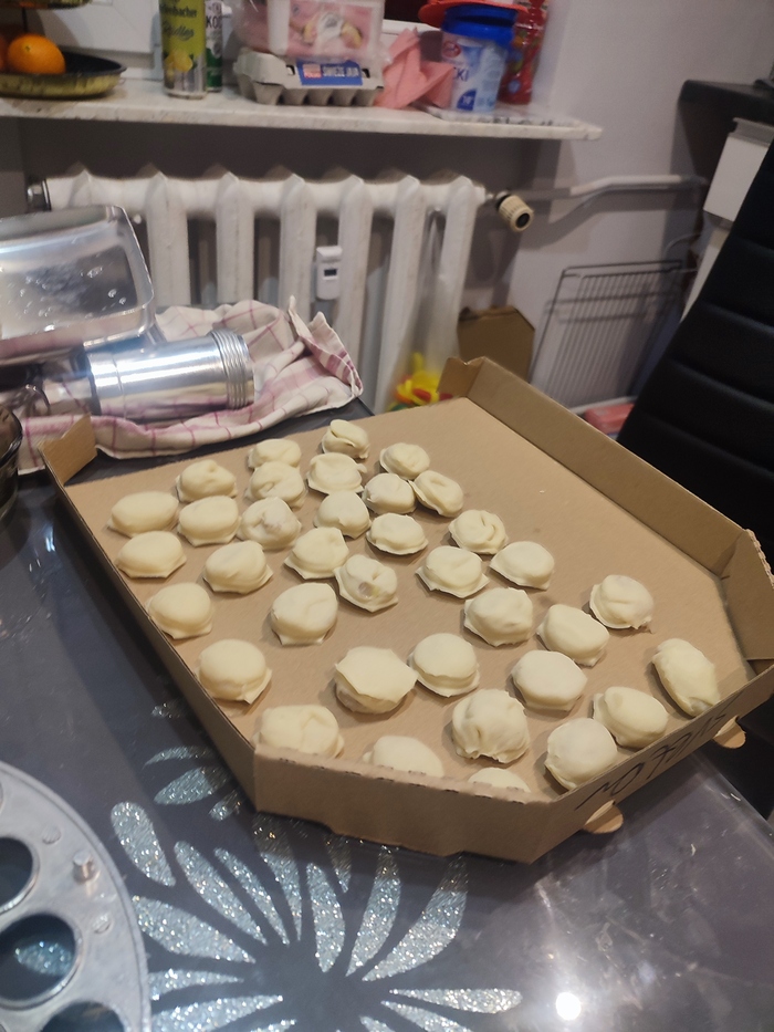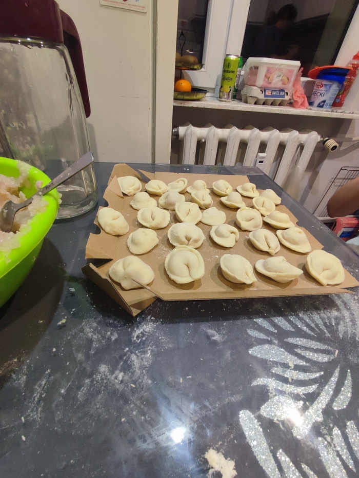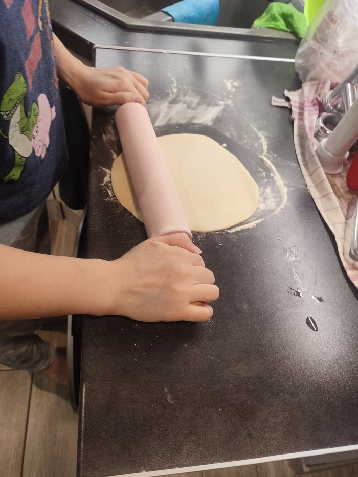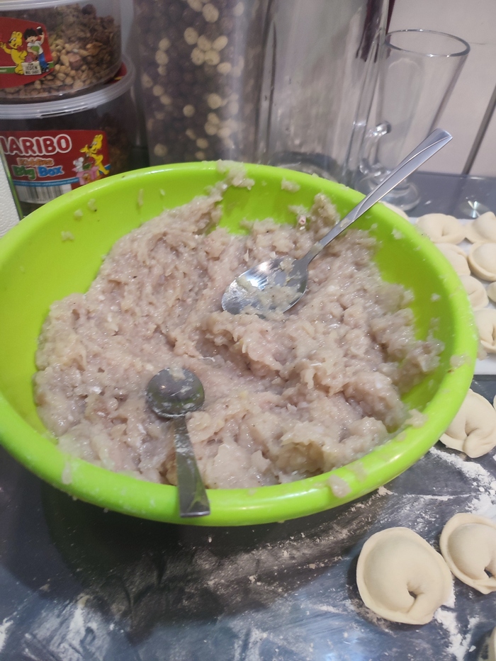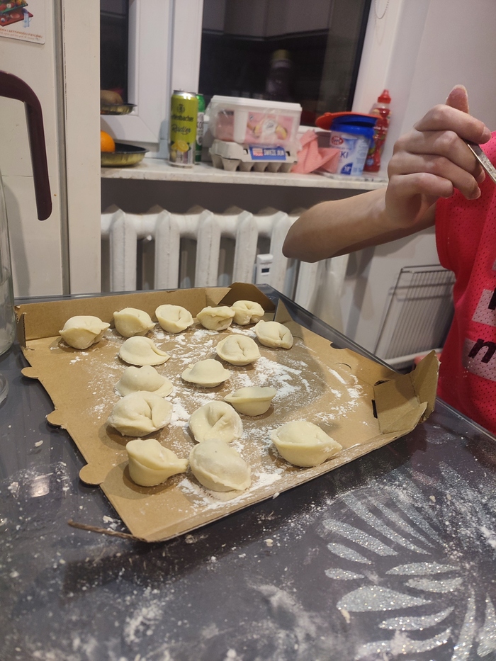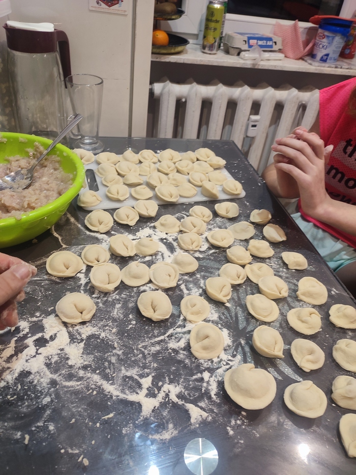 Замешали ещё теста и налепили ещё. Надеюсь будет вкусно. Крафтить пищу дочери понравилось.