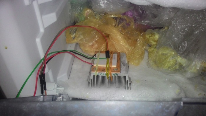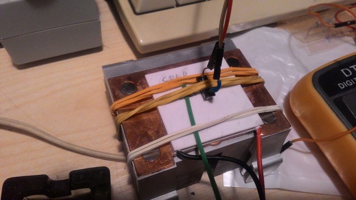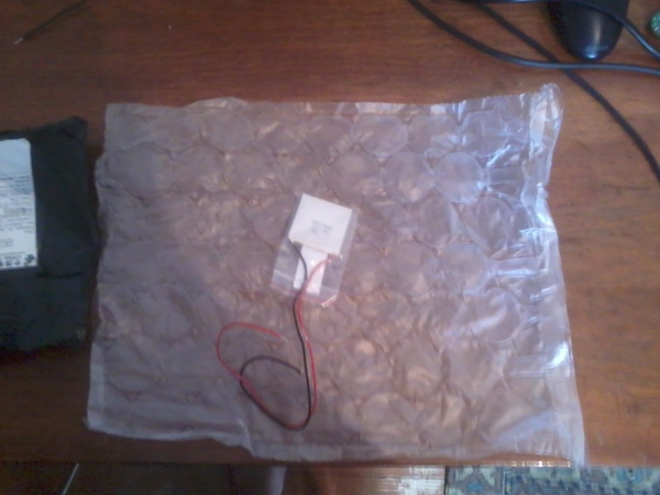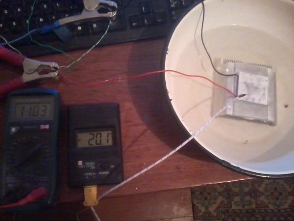 Сначала одна сторона резко охладилась, сильнее чем при тестах на 7.4 вольта, но потом начала нагреваться, так как обратная сторона тоже так не хило нагрелась, а радиатор от видяхи и кулер от старого ПэКа не справлялись с её охлаждением. Так как эти элементы в середине имеют полупроводники, которые припаяны легкоплавким припоем (который плавиться при температуре около 125 градусов Цельсия) то я решил дальше (читай дольше) не тестировать при 11,1 вольтах, от греха подальше. А подождать нормального процессорного радиатора и сделать ещё один тест.