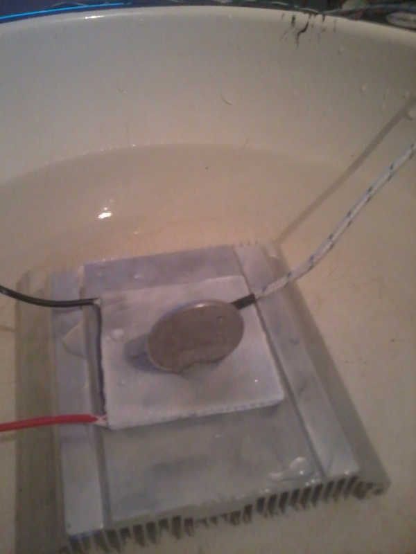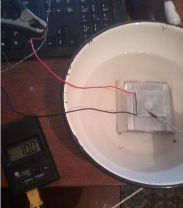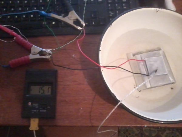 Далее я подключил нагрузку, в виде моторчика, снова вскипятил воду и залил в кружку, включив перед этим тестер в получившуюся электрическую цепь. Максимум который он выдал - 130 миллиампер. Опять же, хреновое охлаждение, на этот раз я взял старую систему охлаждения с видяхи и направил поток воздуха между гребнями радиатора.