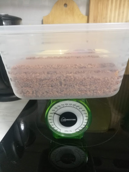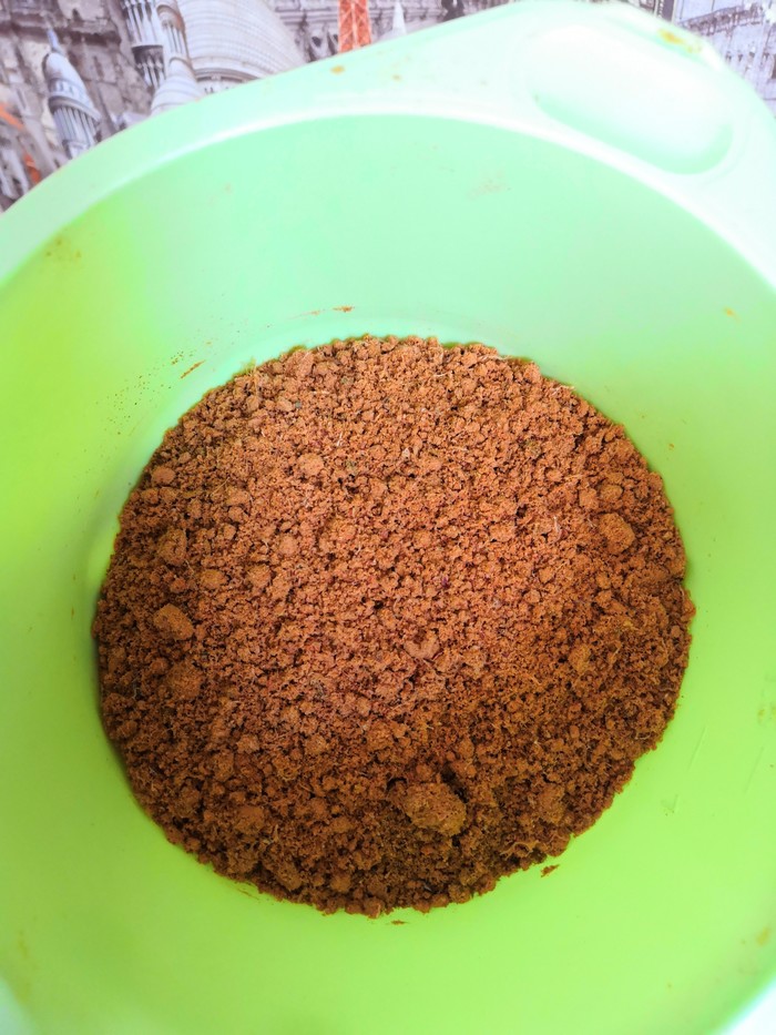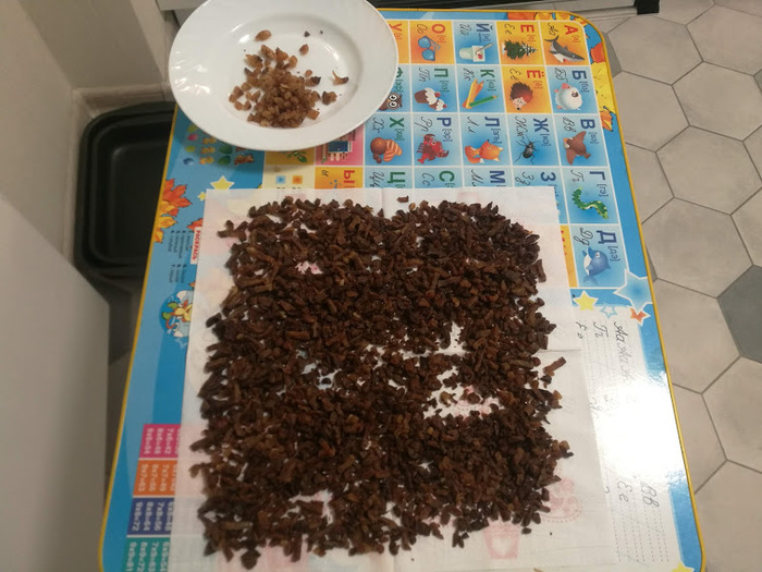 После, я измельчила сухое мясо и овощи в кофемолке до состояния муки, так же, измельчила овсянку, перемешала все ингридиенты , добавила немного соли.