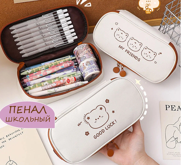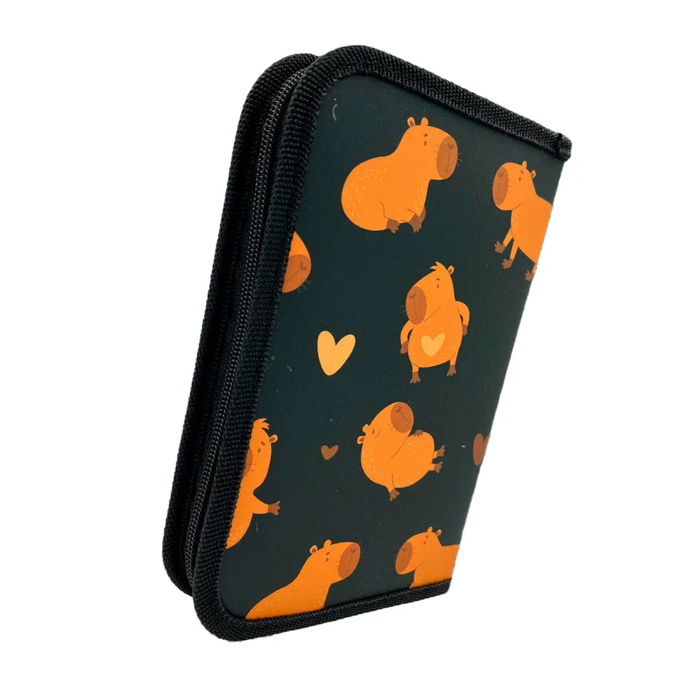 Компактный пенал с милым принтом капибар с обеих сторон. Сделан из плотного ламинированного картона с мягким покрытием — сохраняет форму и рисунок при частом использовании. Внутри одно отделение с резинками на 23 предмета. Закрывается на молнию, весит немного и удобен для детей с 1 по 4 класс. Ссылка на него