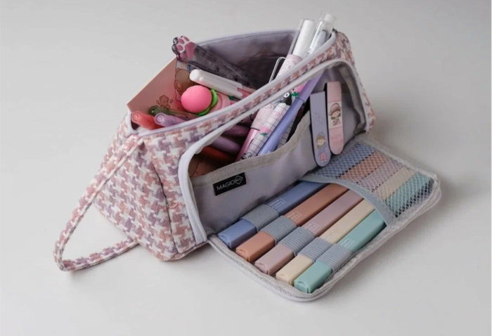 Текстильный пенал в розовую гусиную лапку — яркий и вместительный вариант. Главное отделение дополнено боковым отсеком на молнии, который откидывается и позволяет быстро получить доступ к нужным предметам. Внутри — множество резинок и кармашков для надёжного хранения. Отлично подойдёт девочкам, имеющим много канцелярии для учёбы и творчества. Ссылка на него