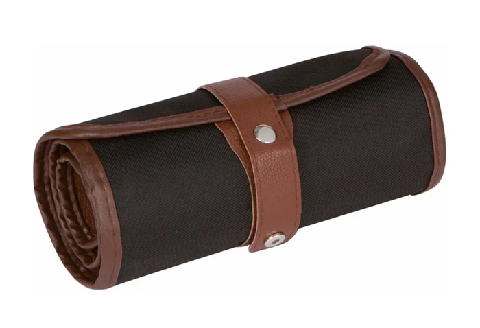 Необычная модель из чёрного текстиля со вставками из коричневой экокожи. В развёрнутом виде это длинная лента с 36 резинками и кармашками для ручек, карандашей, кистей и других принадлежностей. В сложенном — аккуратный свиток на кнопке. Удобен для тех, кто рисует или занимается творчеством. Ссылка на него