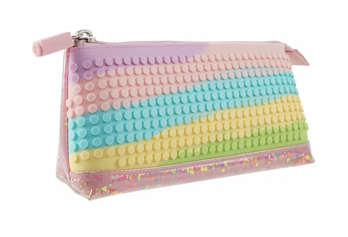 Яркий пенал из мягкого силикона для любительниц всего необычного. Главная фишка — специальная панель с точками для крепления 80 разноцветных деталей. С их помощью можно делать любые рисунки и надписи. Меняйте дизайн хоть каждый день — по настроению. Подойдёт девочкам, которые хотят выделиться и превратить пенал в персональный арт-объект. Ссылка на него