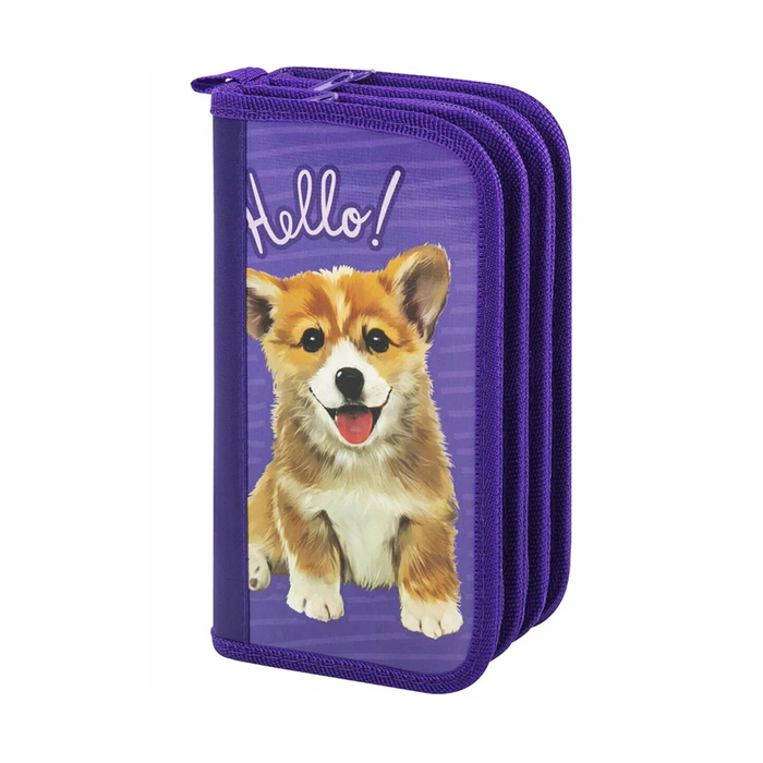 Пенал в формате книжки — наиболее удобная модель для младших классов. Внутри три отделения на отдельных молниях, которые помогают не смешивать канцелярию и приучают к порядку. Он лёгкий и компактный — такой удобно носить в ранце малышам. Забавный рисунок с милым щенком корги поднимет настроение в первые школьные дни. Ссылка на него